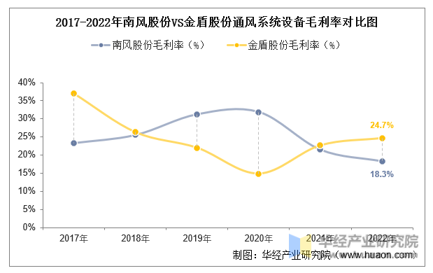 2022年,南风股份的通风系统设备行业毛利率为18.3%,较上年减少了3.2个百分点;金盾股份的通风系统设备行业毛利率为24.7%,同比增加了2.0个百分点。